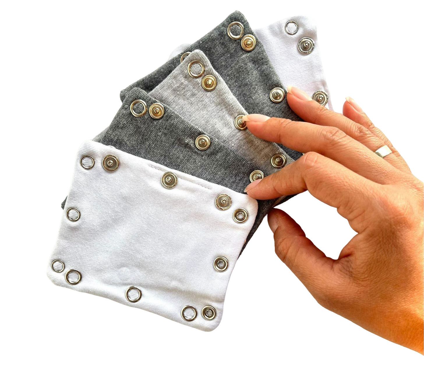 Nuestra solución es única en el mercado y cuenta con patente a nuestro nombre, que incorpora broches de dos tamaños diferentes, lo que garantiza que se adapte a una amplia variedad de bodys en el armario de tu bebé.